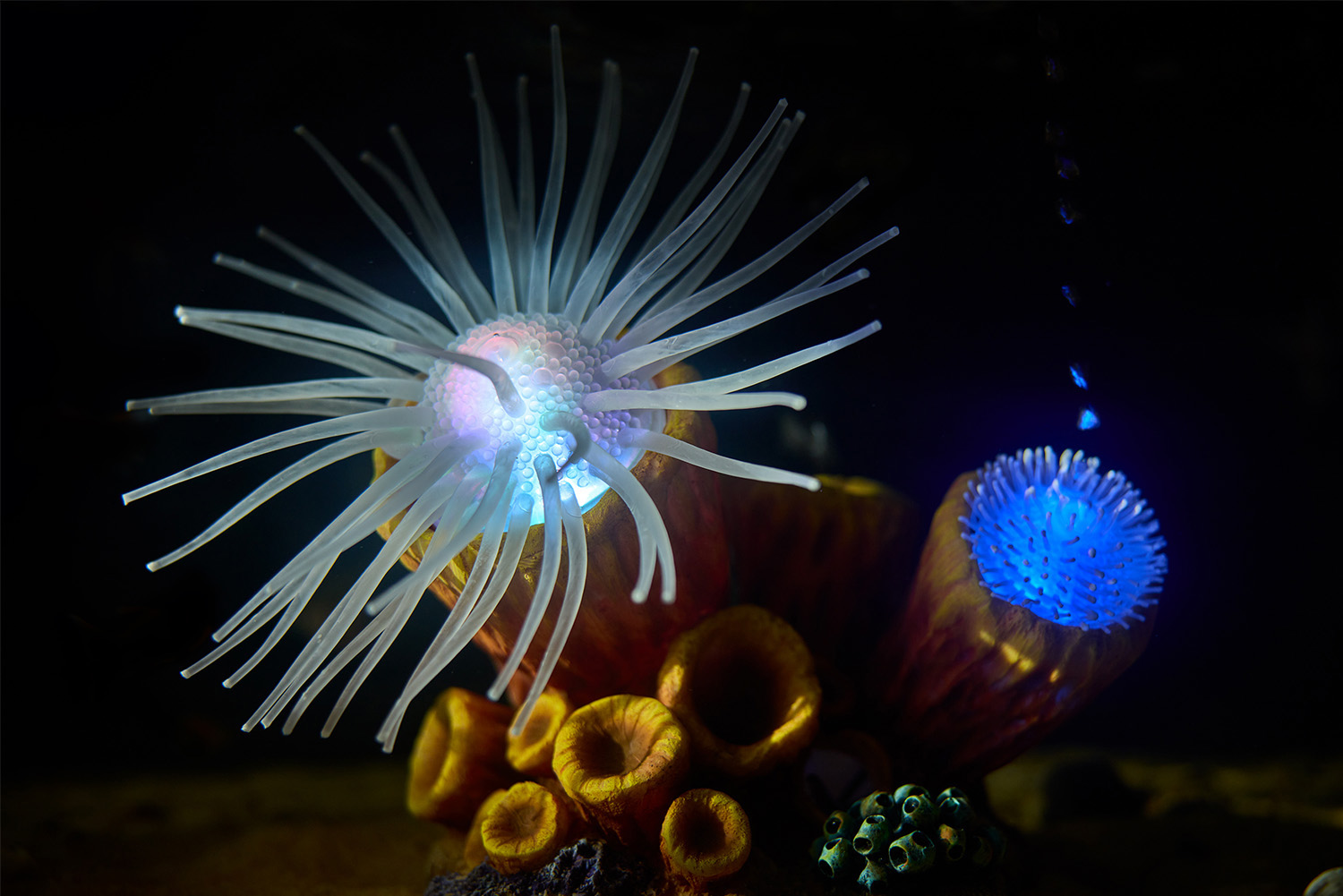 Reef Dancers embed moving, backlit anemones into a variety of resin ornamental bases. They continually move in the aquarium and are driven by a standard aquarium air pump.